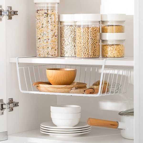 比如你家櫥柜隔板與隔板間的間距很大,明顯有一半的空間是浪費的,加個掛式置物架就可以完美利用閑置空間。